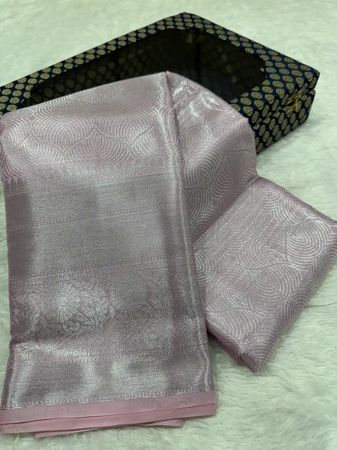 Baby Peach Breathable Katan Tissue Silk Saree with Rich Pallu and Blouse