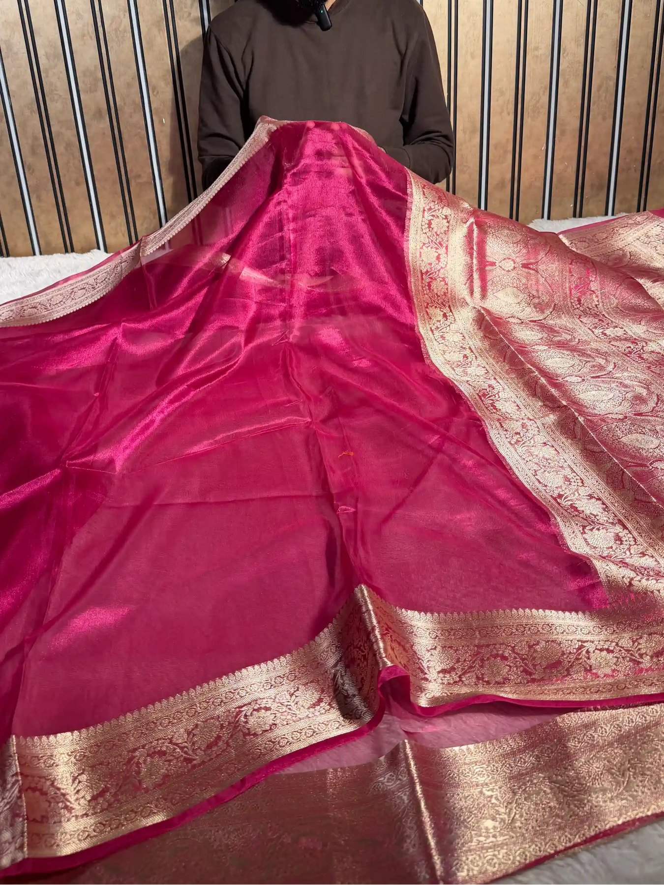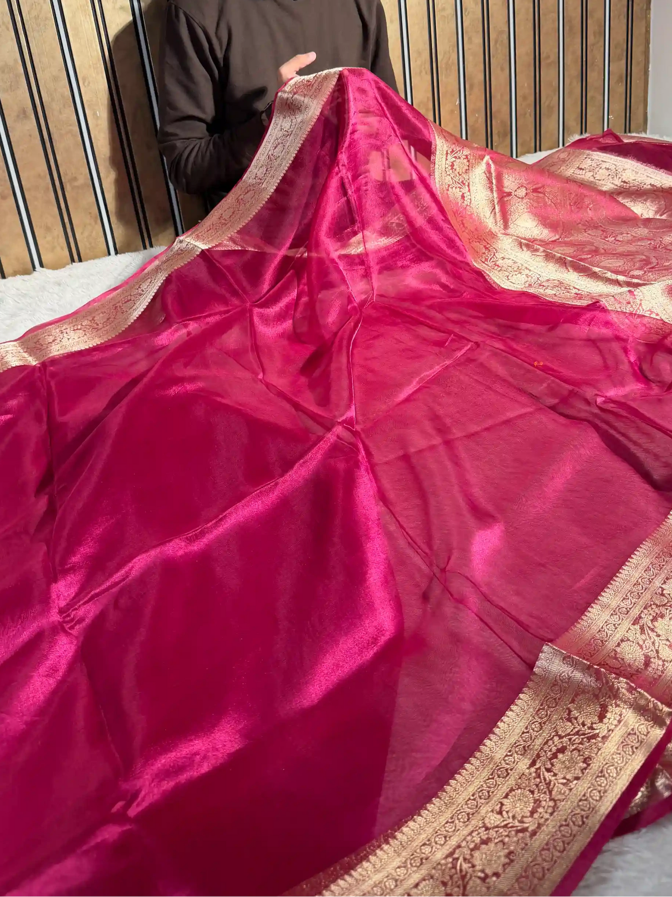 Metallic Rani Pink 100% Pure Tissue Silk Traditional Jacquard Weave Banarasi Saree