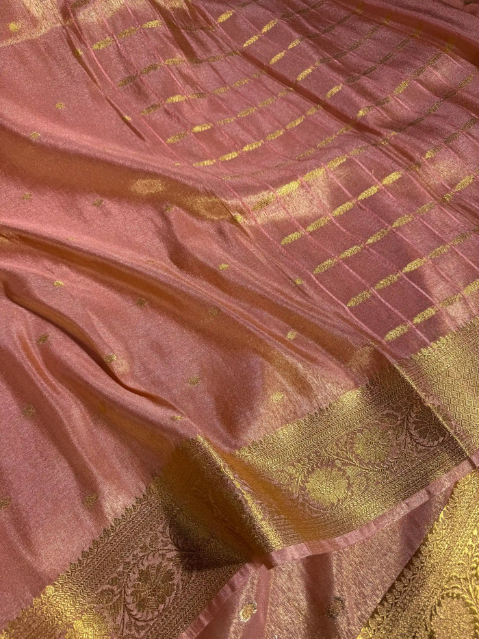 Baby Peach Breathable Katan Tissue Silk Traditional Buta Banarasi Saree