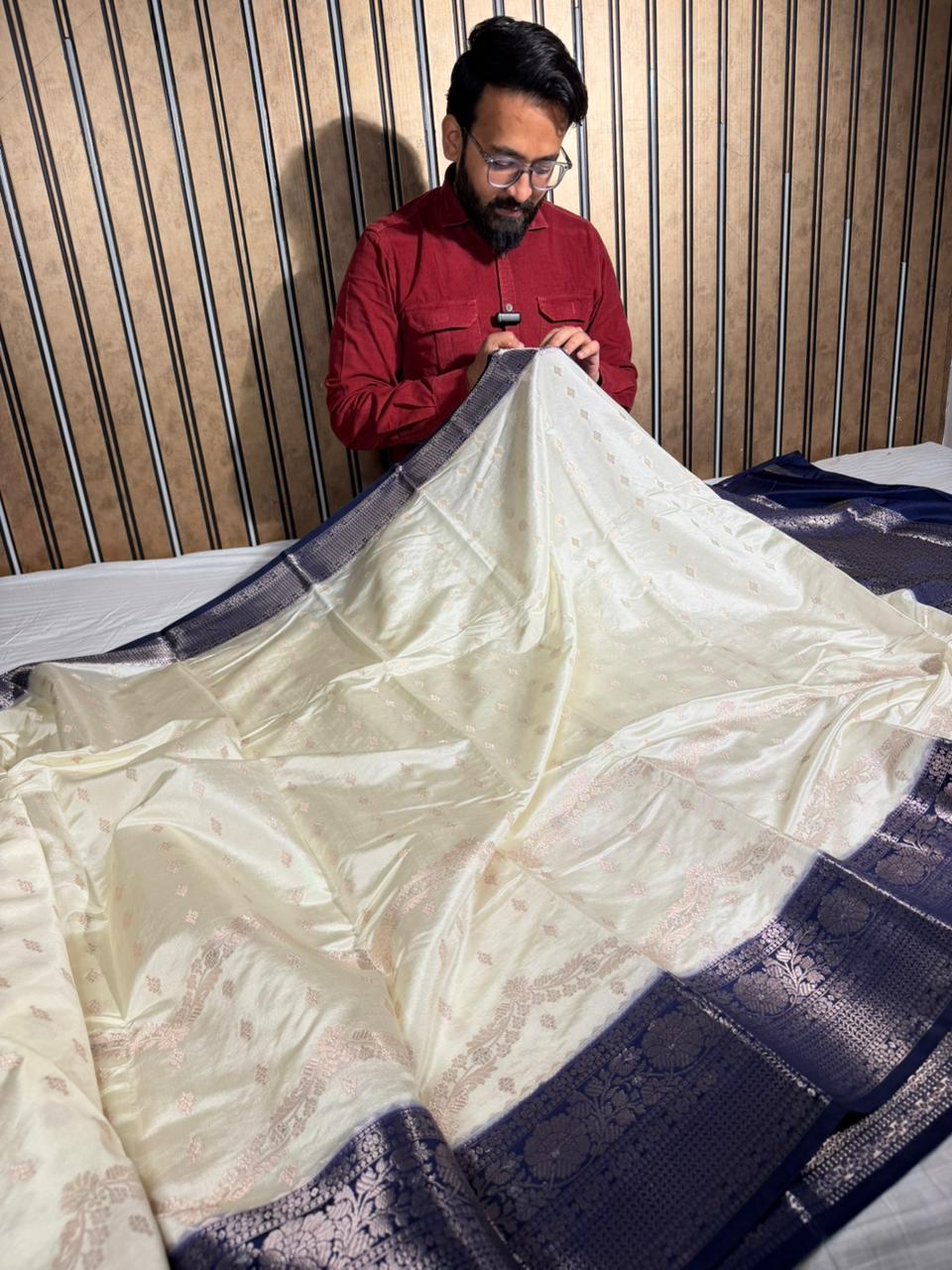 Light Cream Chinia Silk Intricate Weave Banarasi Saree Handwoven Banarasi saree in premium chinia silk with delicate intricate patterns. The light cream base showcases traditional weaving craftsmanship, perfect for weddings and celebrations.