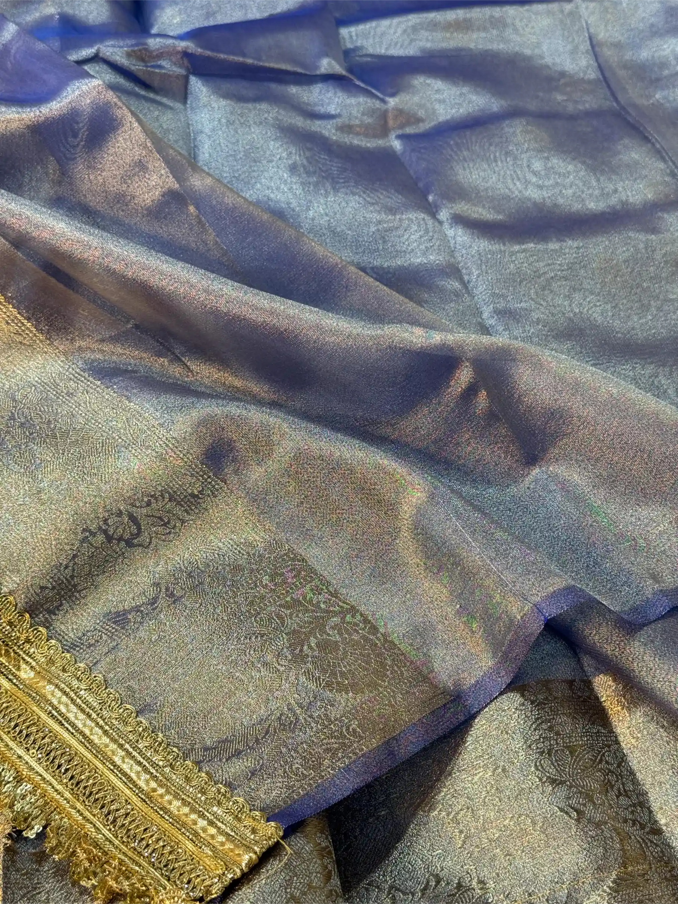 Turn heads in this elegant Royal Blue Tissue Silk Lace Attached Banarasi Saree! Made with luxurious tissue silk, this saree features intricate lace detailing and a stunning royal blue hue. Perfect for any special occasion, this saree will make you stand out with its unique and sophisticated style. (Saree only, blouse not included.)