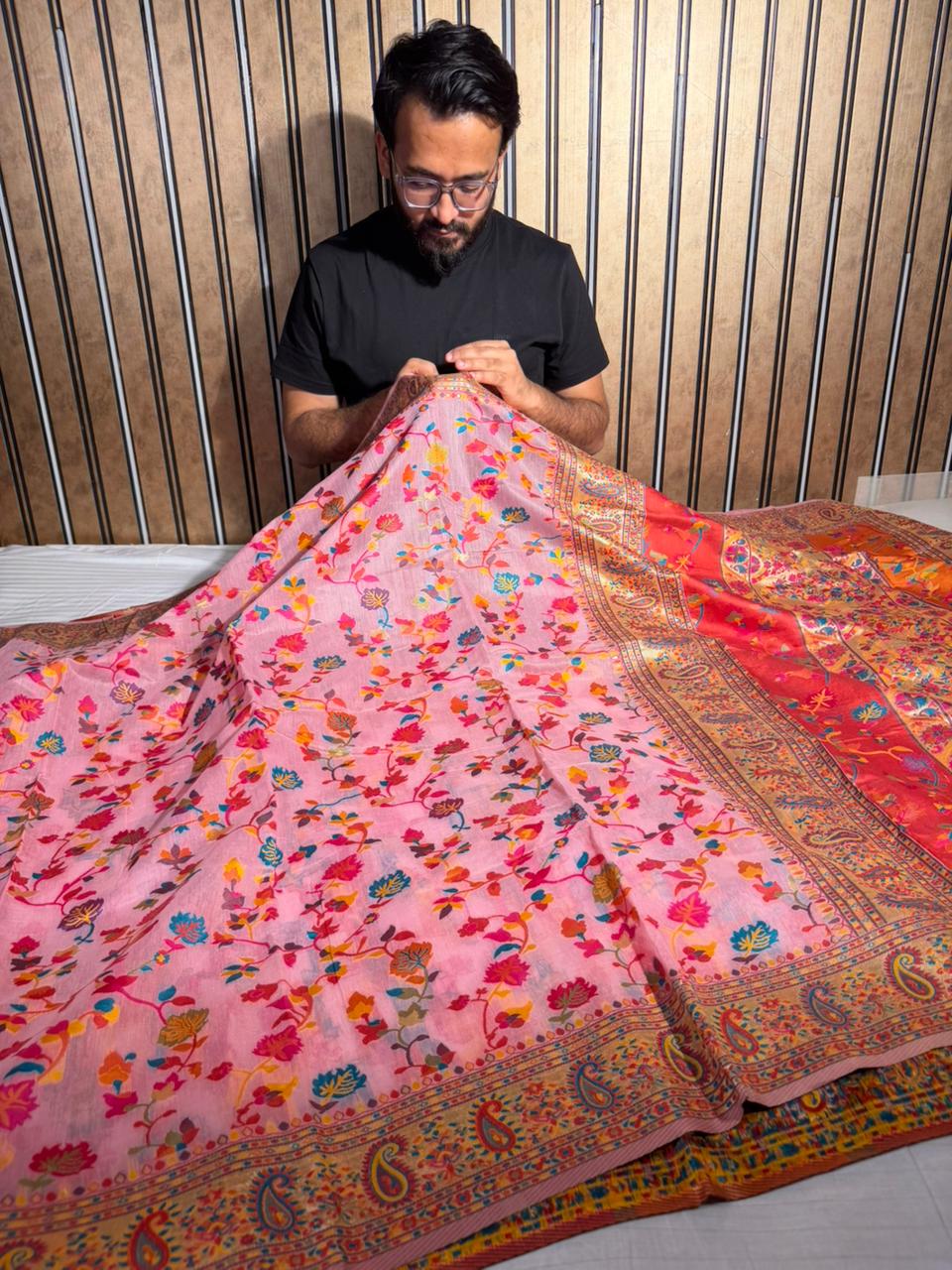 Exquisite baby pink pashmina saree blending soft cotton and silk for refined elegance. Features intricate exclusive work adorning the pallu with coordinated running blouse included. Perfect for discerning occasions.