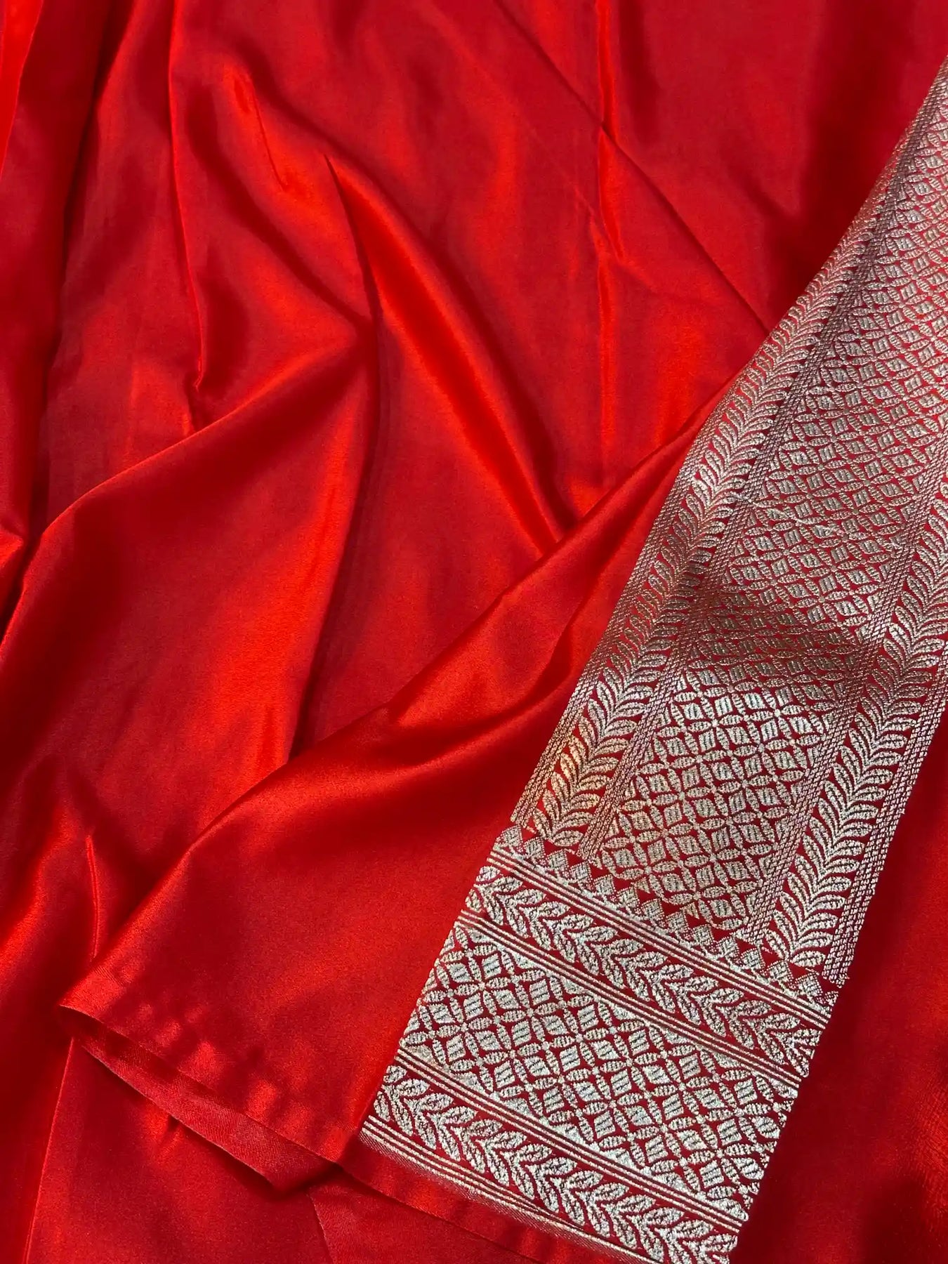 Elevate your bridal elegance with this red Mashru Katan silk saree, featuring intricate Meenakari work and luxurious Banarasi craftsmanship for a timeless, sophisticated celebration look.