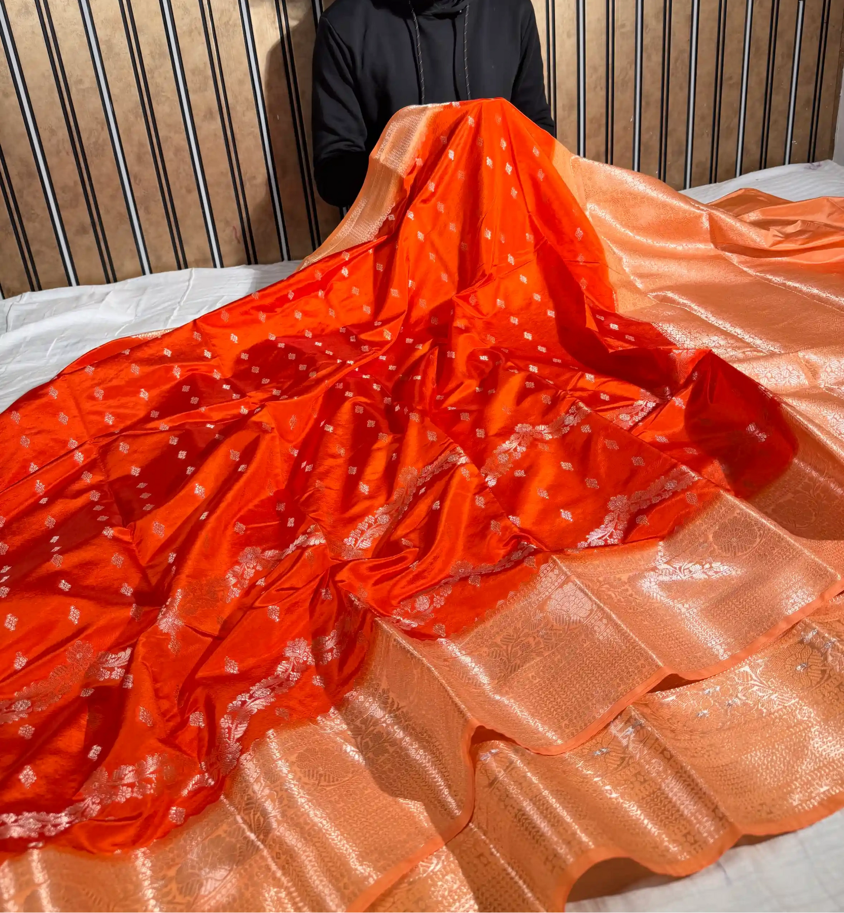 Vibrant burnt orange meets audacious design in this Banarasi masterpiece. Banana silk's lustrous drape pairs with an eccentric weave pattern that defies convention. Bold, unapologetic luxury for the fearless bride.