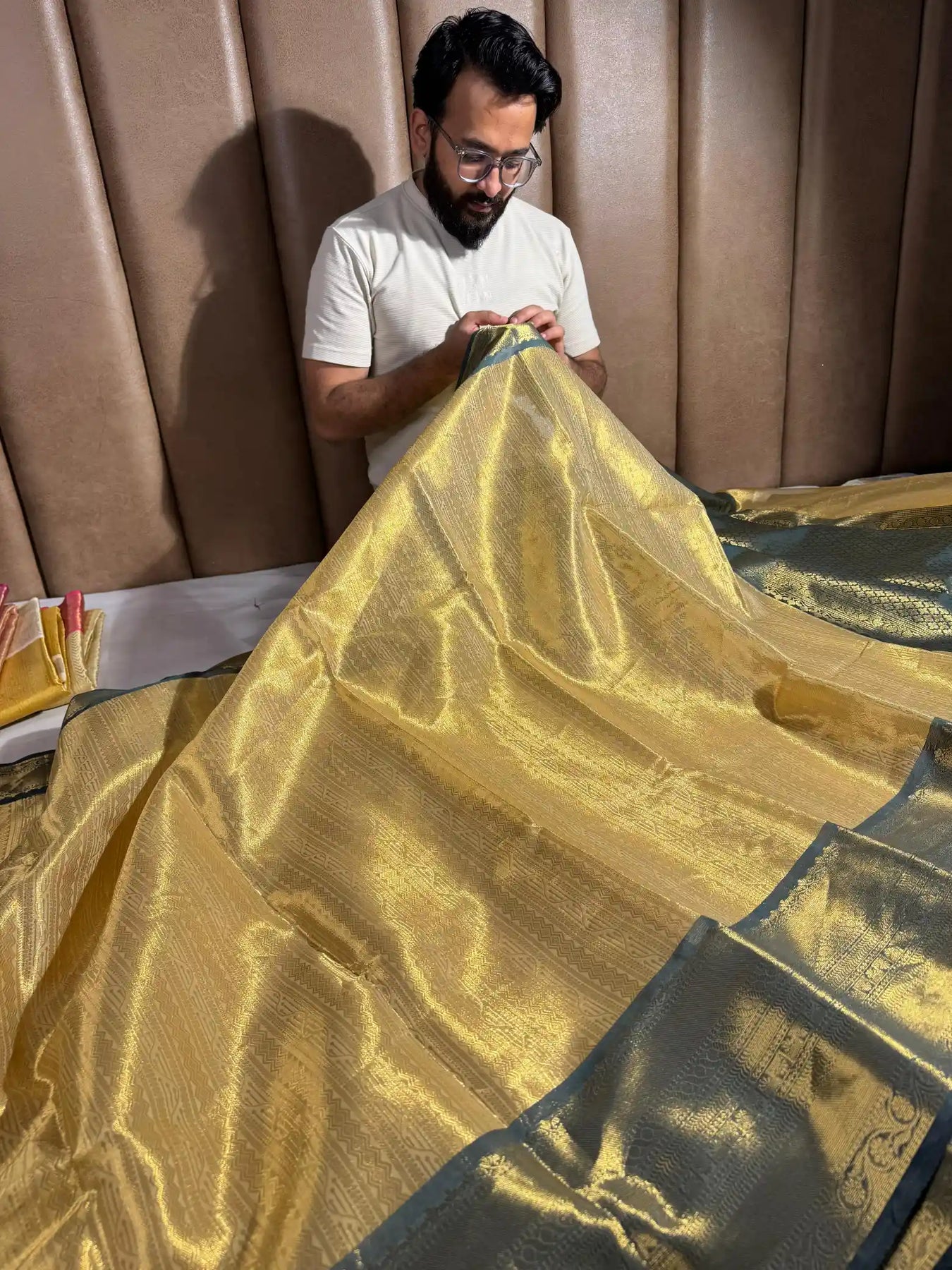 Wrap yourself in the shimmering charm of this Dark Gold Contrast Embossed Tissue Silk Banarasi Saree — where tradition meets sparkle for your most dazzling moments!
