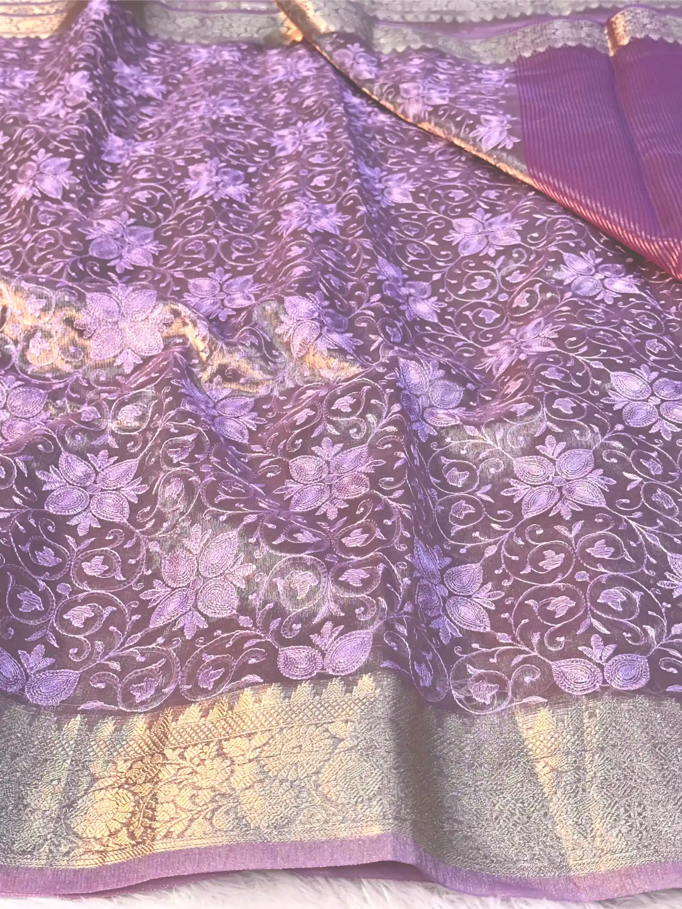 This Lavender Tissue Silk Banarasi saree features intricate Chikankari embroidery, blending traditional craftsmanship with luxurious fabric for an elegant and timeless ensemble perfect for special occasions.