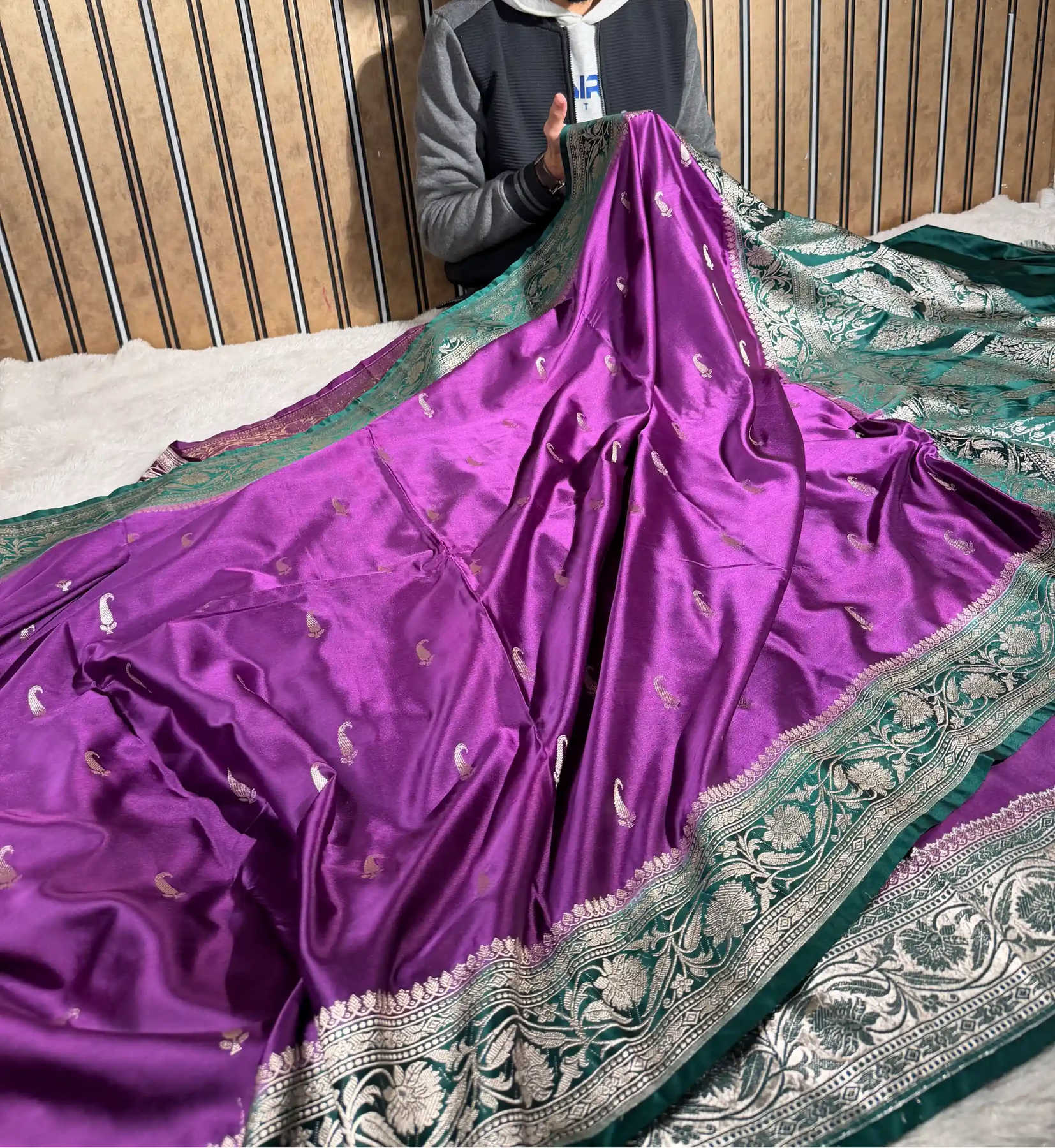 Luminous purple Mashru Katan weave showcases traditional Banarasi craftsmanship with a refined sheen. Heritage design features intricate zari detailing and luxurious drape, perfect for celebrations demanding timeless elegance and artisanal sophistication.