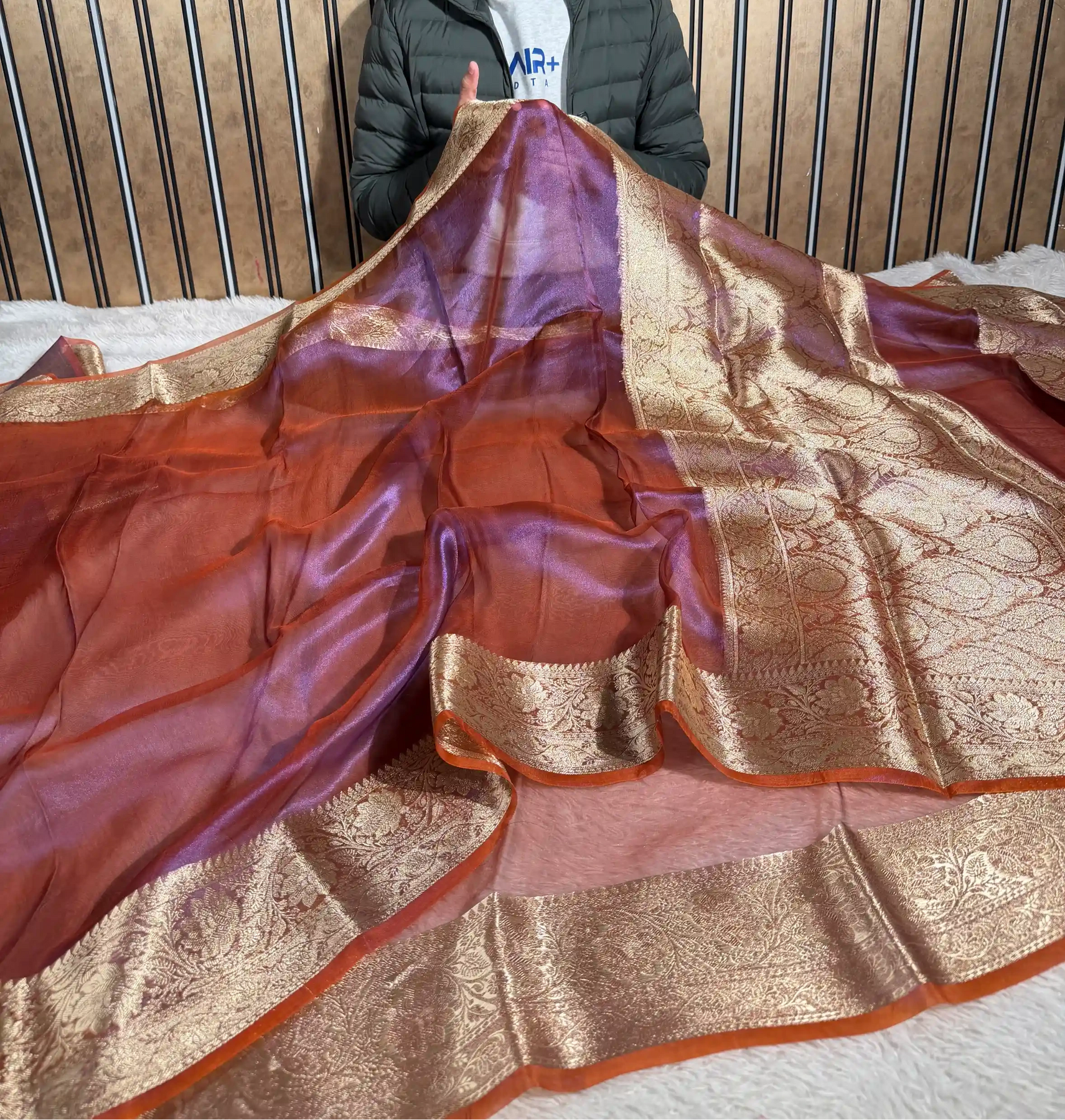 Dhoop-Chaon Purple 100% Pure Tissue Silk Jacquard Weave Banarasi Saree Boldly radiant in striking purple, this tissue silk Banarasi masterpiece commands attention with intricate jacquard weaving. Pure silk craftsmanship meets fearless color—an audacious choice for the woman who refuses to blend in.
