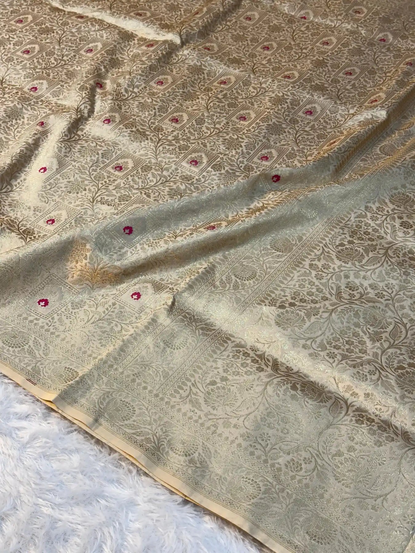 This exquisite Ivory Pure Katan Silk Banarasi Saree is the epitome of luxury and elegance. Made from premium pure Katan silk, the exclusive Ivory shade and Meenakari texture make this saree a true work of art. Elevate your style and leave a lasting impression with this timeless piece