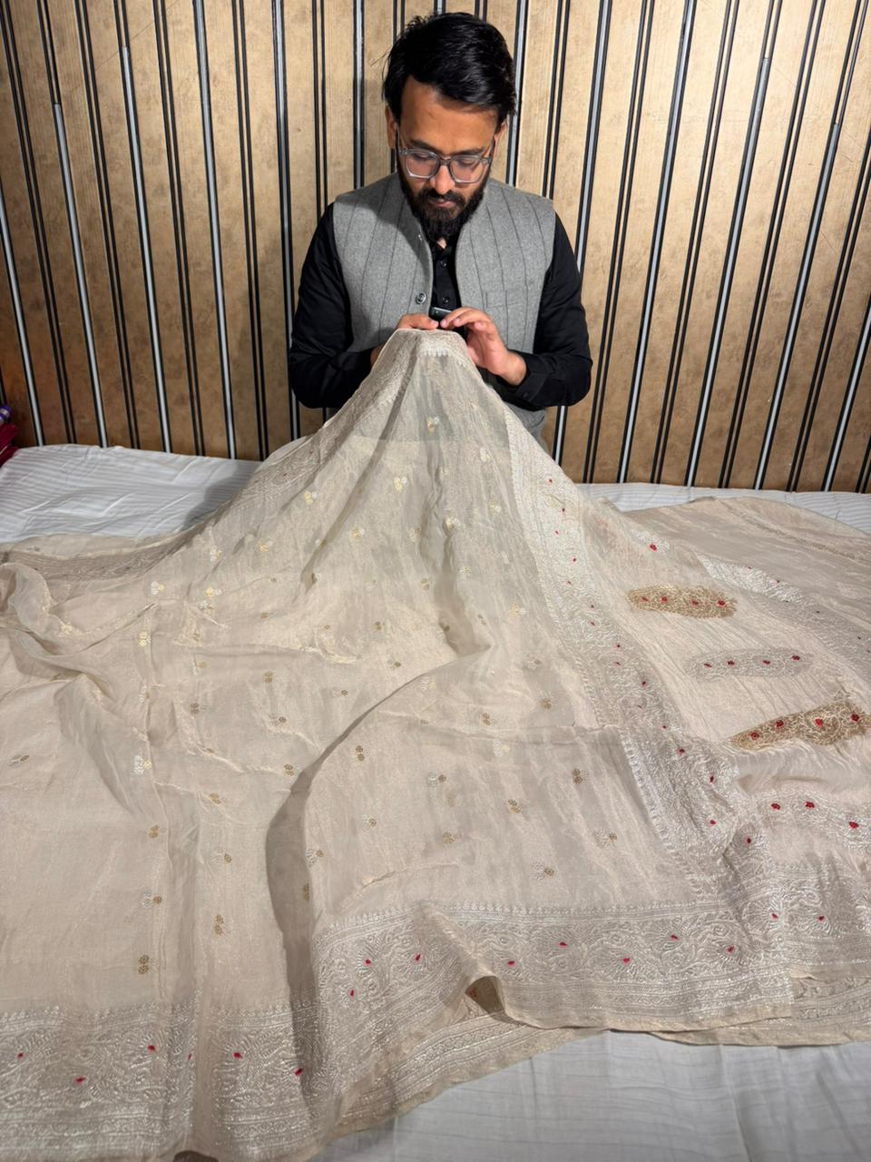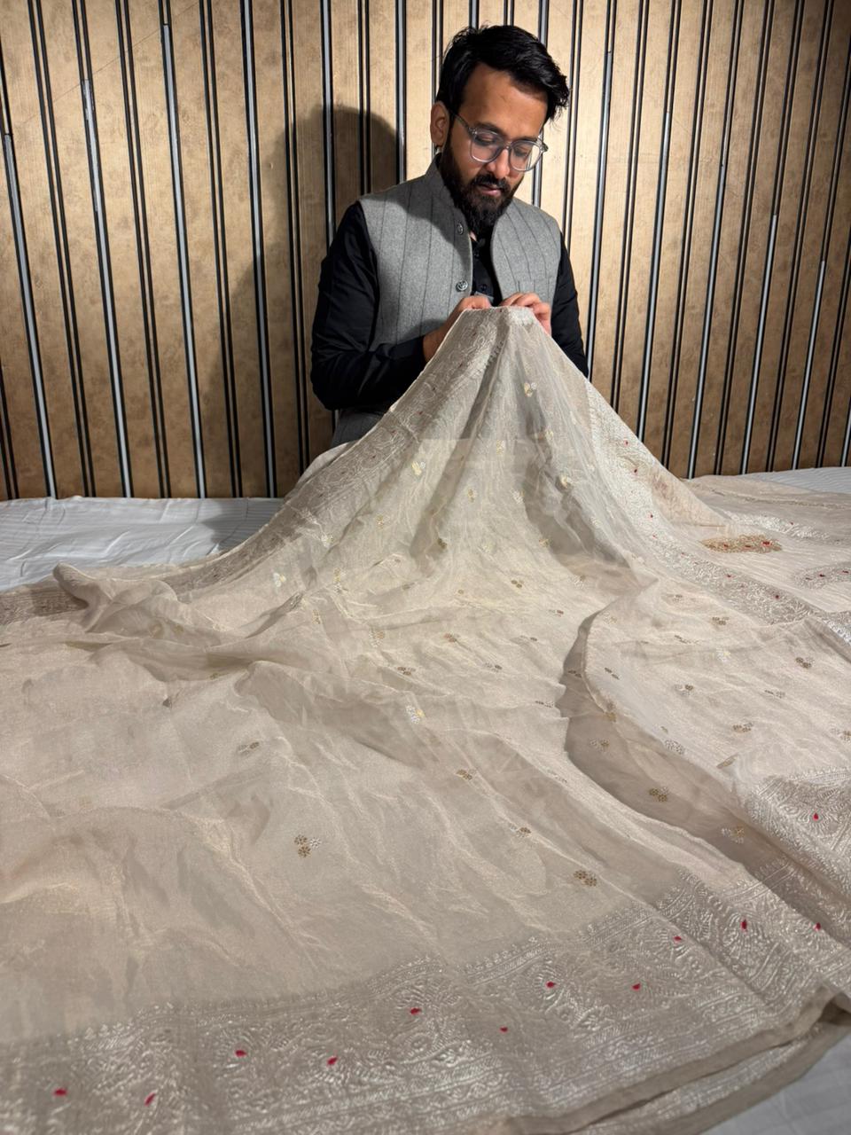 Drape yourself in timeless elegance with this authentic Banarasi saree, handwoven from pure khaddi tissue silk. Certified genuine, this ivory masterpiece showcases traditional craftsmanship and natural lustre, perfect for your most cherished celebrations.