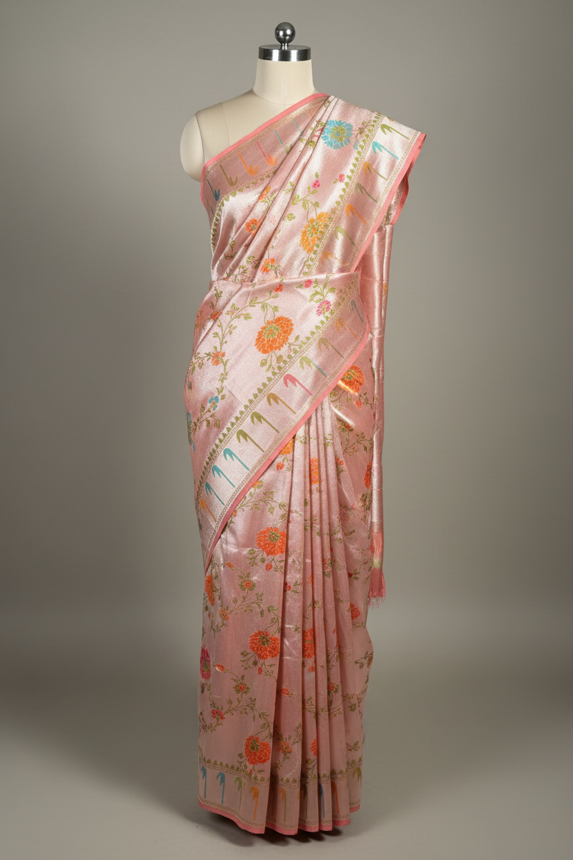 Exquisite handwoven Banarasi saree in lustrous metallic peach tussar georgette. Silk Mark certified for authenticity and purity. This masterpiece features intricate traditional craftsmanship, perfect for weddings and celebrations. Timeless elegance meets superior quality.