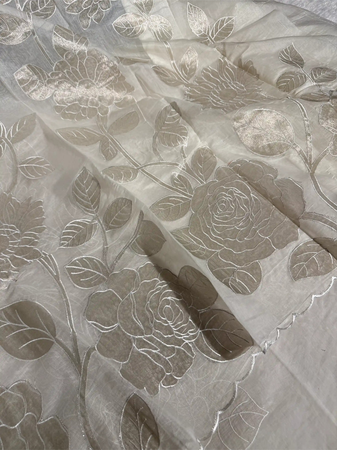 Off White Pure Mul Chanderi Appliqué Work Banarasi Saree