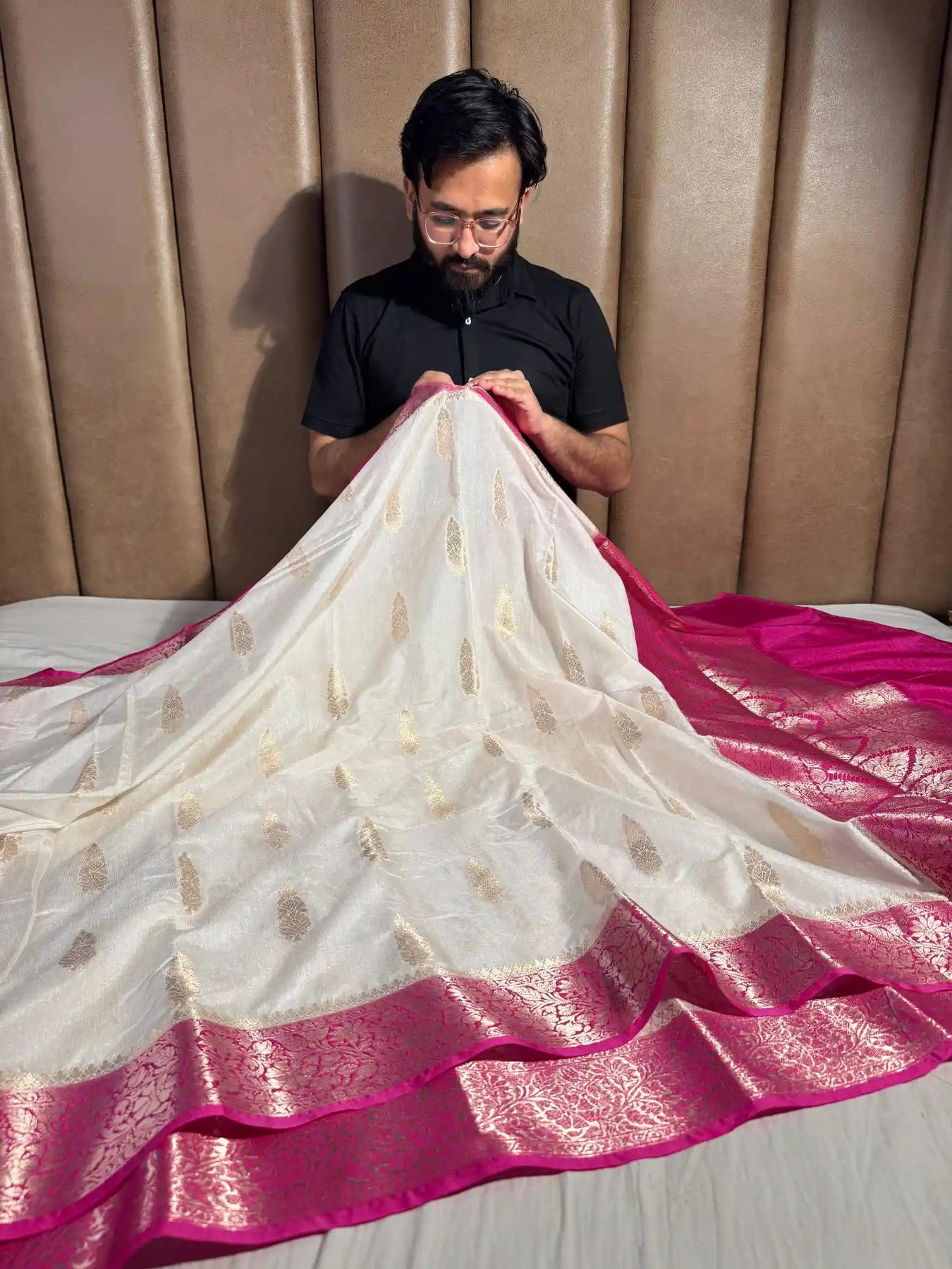 Creame Contrast Chiniya Silk Traditional Weaving Banarasi Saree