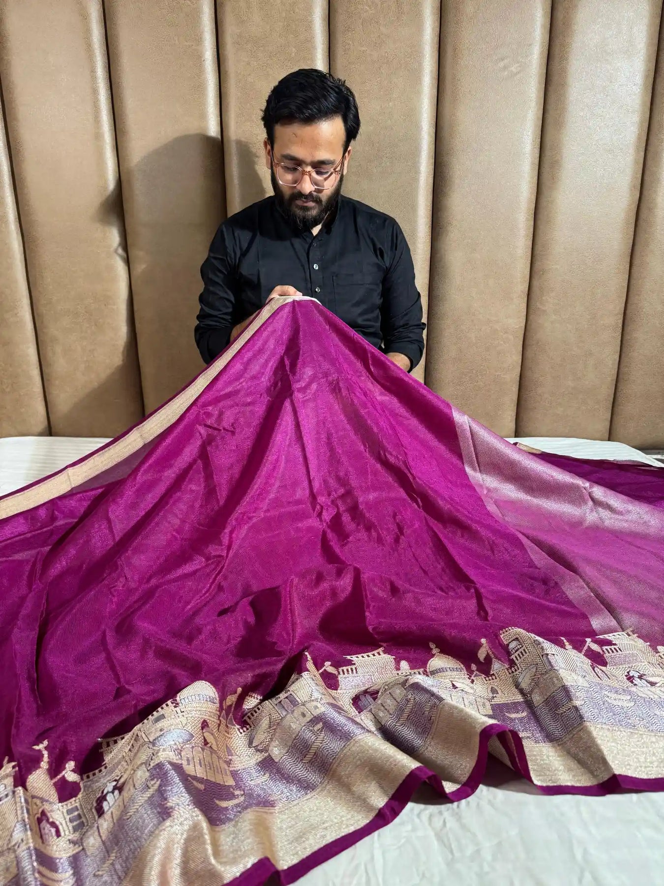 This Purple Georgette Silk Banarasi Saree features an elegant Ghat pattern, blending traditional craftsmanship with lightweight comfort. Perfect for festive occasions, it offers graceful draping and timeless charm.