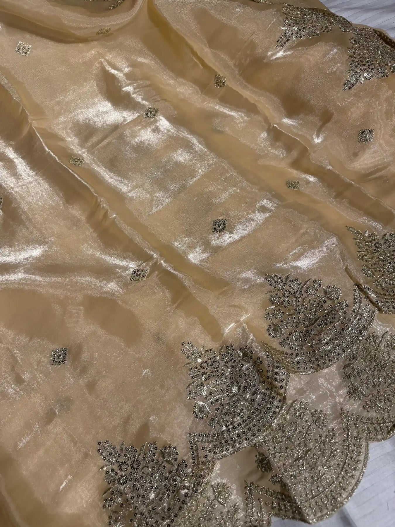 Light Cream Shimmery Tissue Silk Designer Saree