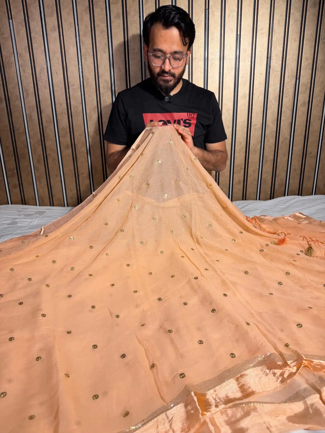 Elevate your ethnic wardrobe with this exquisite light peach viscose georgette saree, adorned with delicate embroidered buti motifs. The fluid fabric drapes gracefully, perfect for festive occasions and celebrations.