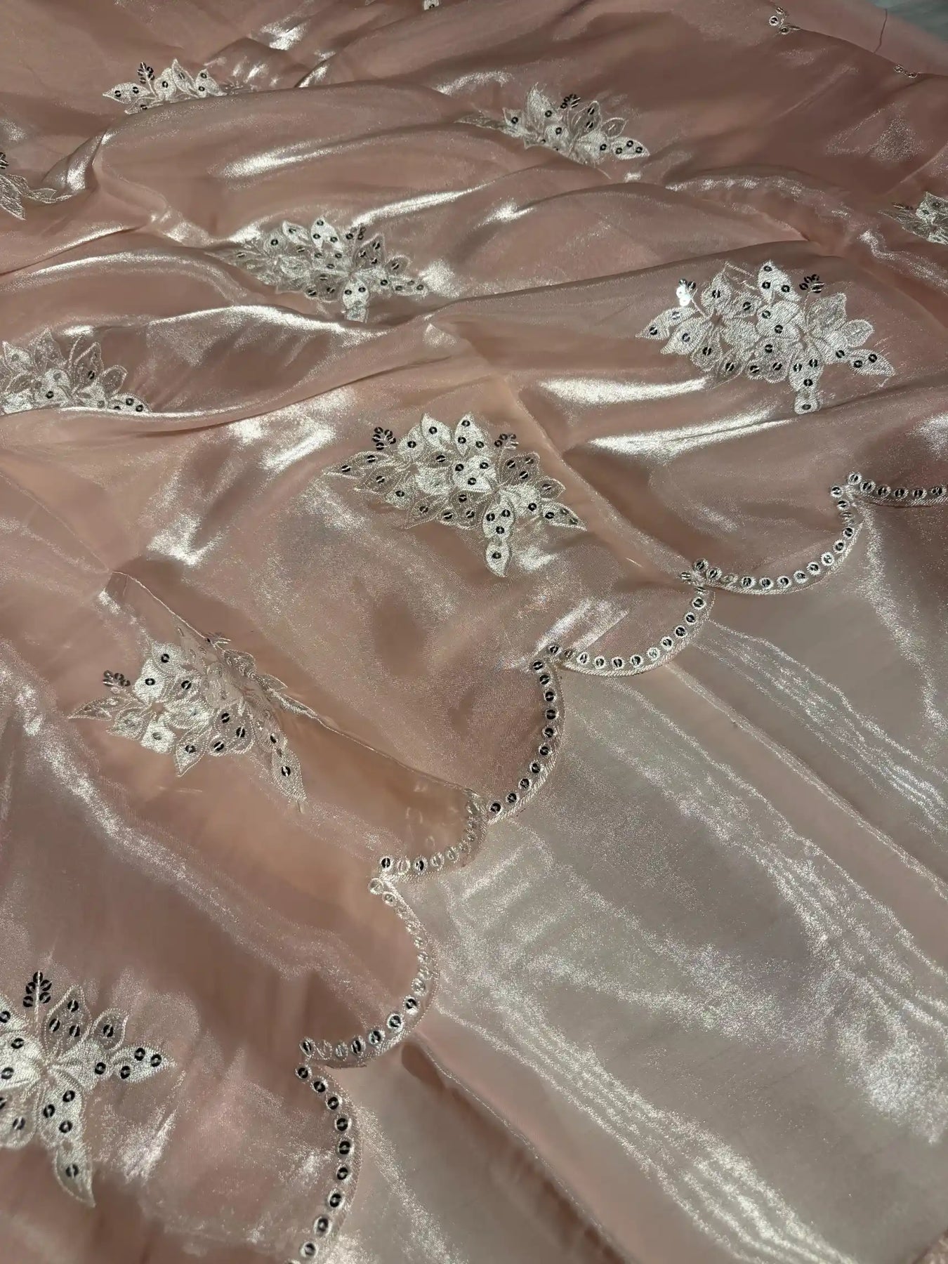 Pastel Peach Shimmery Tissue Silk Designer Saree with Scallop Borders