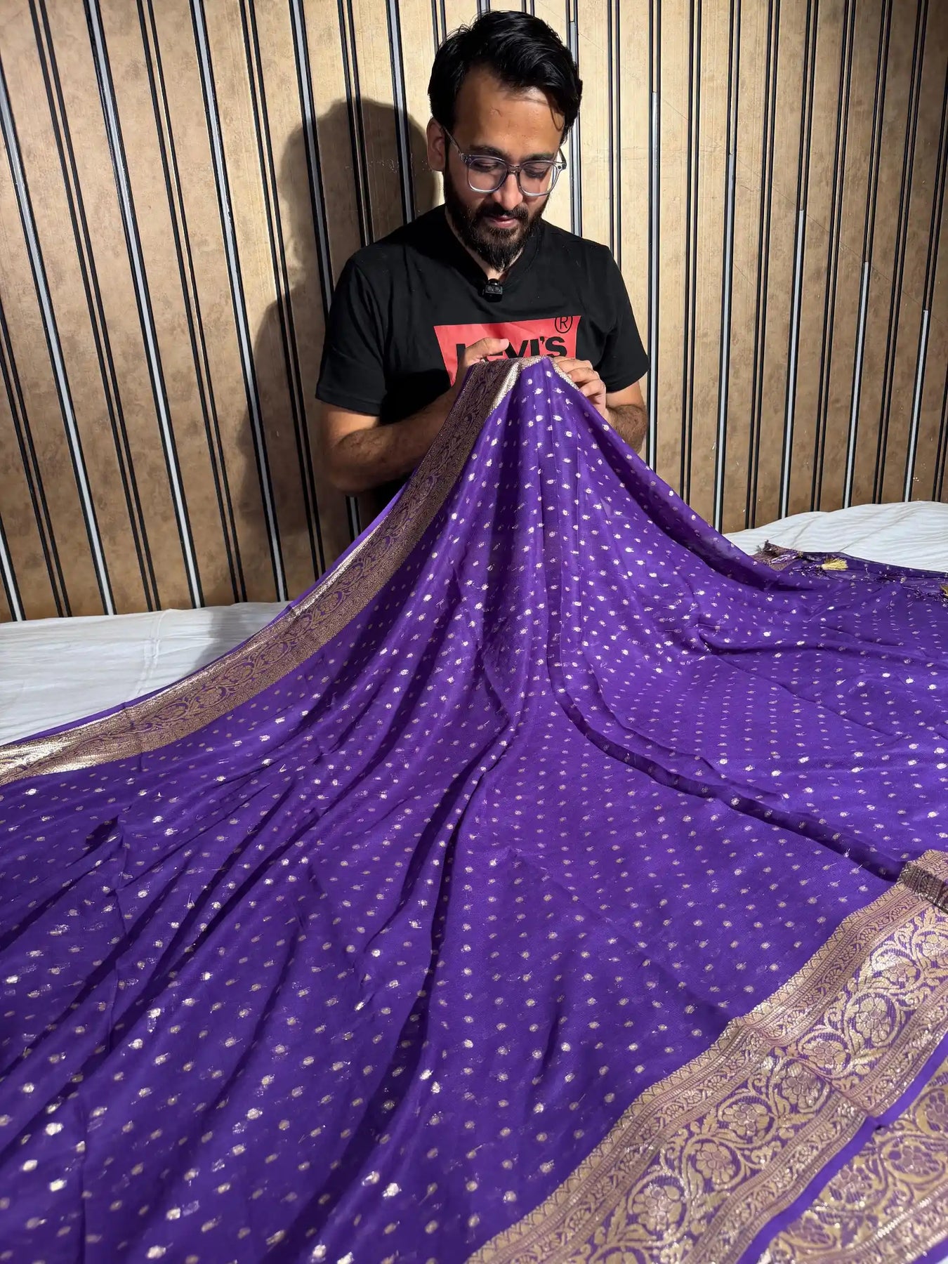 Bright Purple Premium Viscose Georgette Banarasi Saree with Handmade Tassles