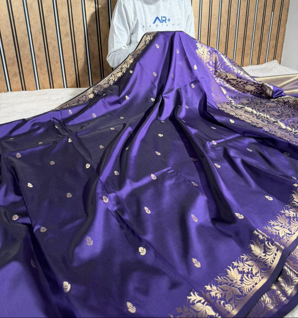 Electrifying purple semi-katan silk Banarasi saree with bold contemporary weaving. Luxurious drape meets modern edge—perfect for the fearless bride who refuses to blend in.