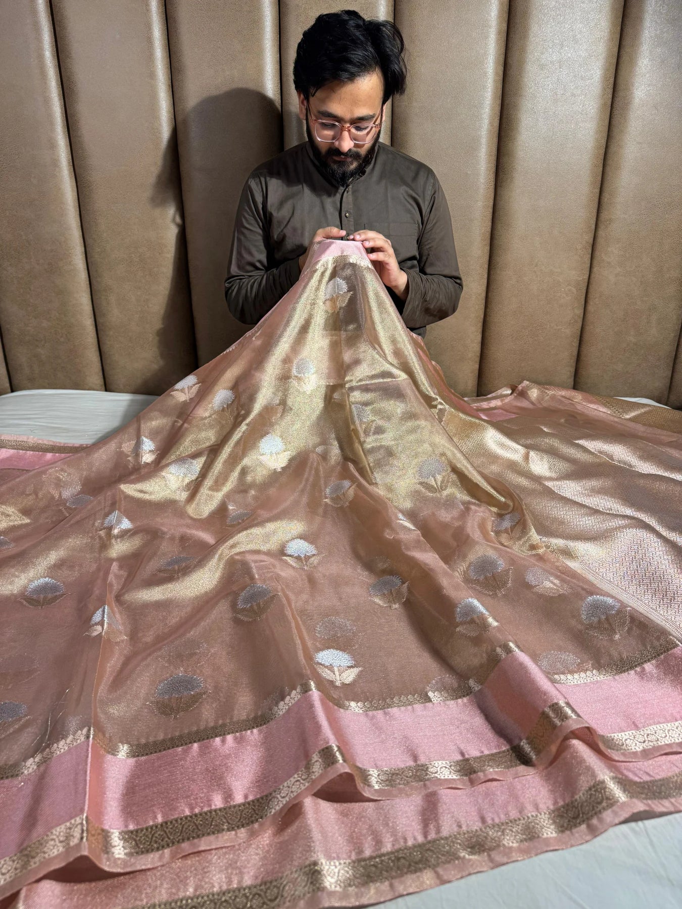 Baby Pink Tissue Silk Flower Buta Banarasi Saree